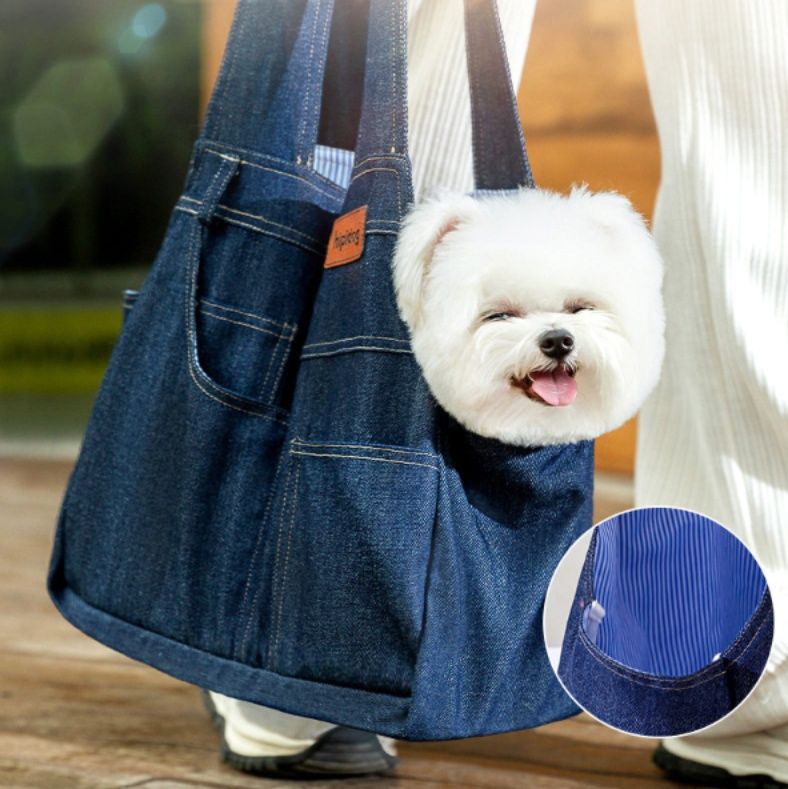 カジュアルなデニム風素材を使用した小型犬に最適な犬バッグです。 内側はストライプ柄の柔らかな生地でクッション性があり、愛犬を優しく包み込みます。 肩掛けできるショルダーベルト付きで、お出かけや通院時にも便利です。 サイドポケットも付いており、小物の収納も可能です。 丈夫な作りでしっかりと愛犬を支え、安心してお出かけを楽しめます。