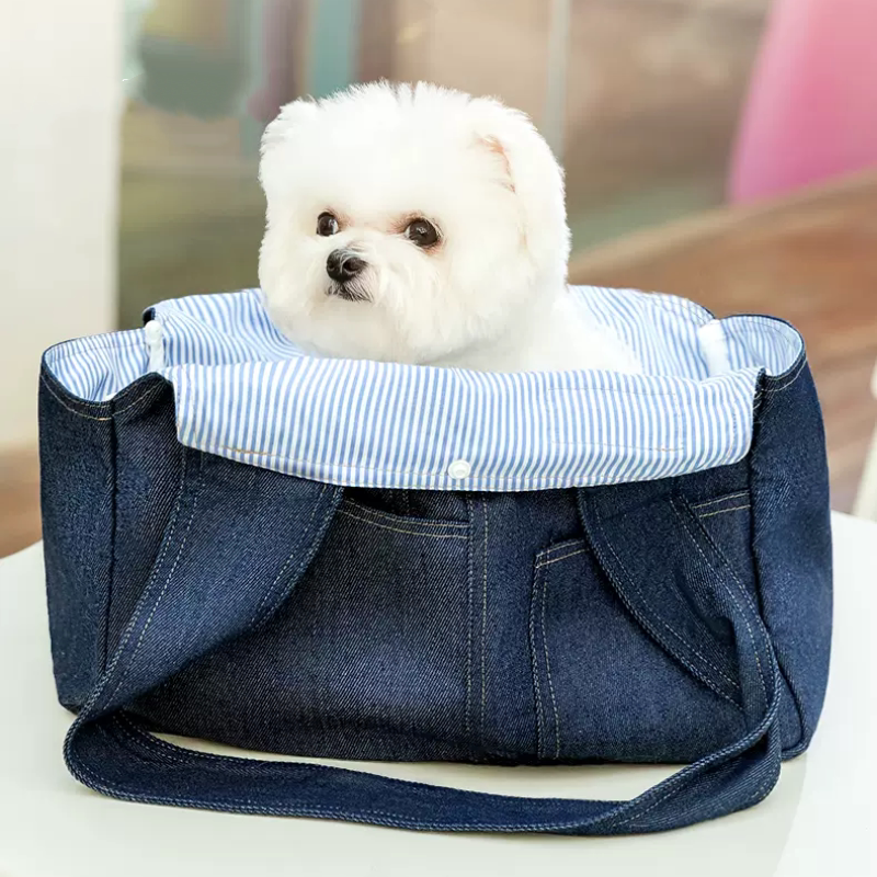 カジュアルなデニム風素材を使用した小型犬に最適な犬バッグです。
