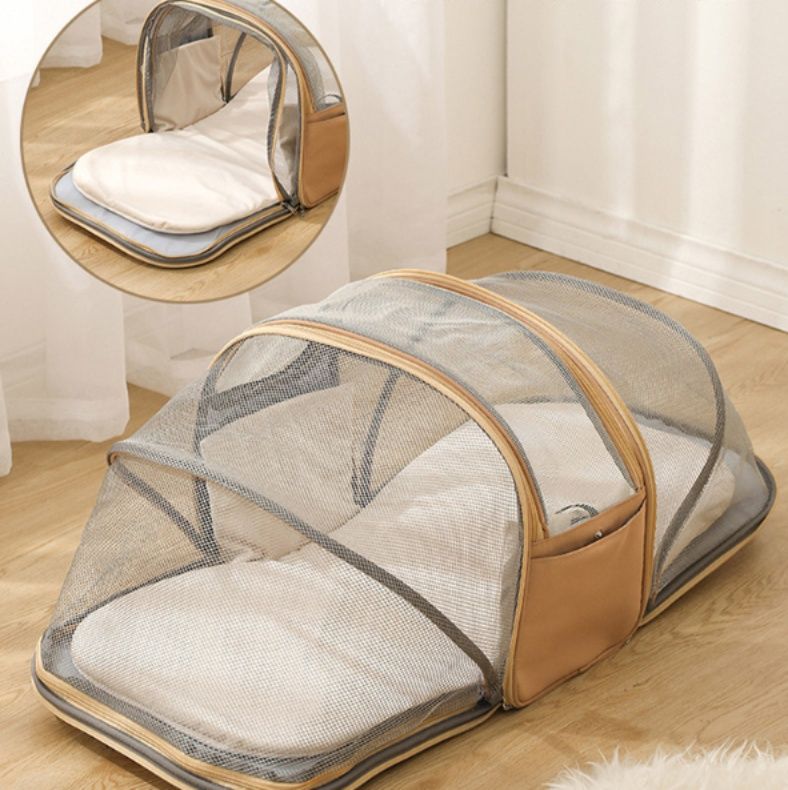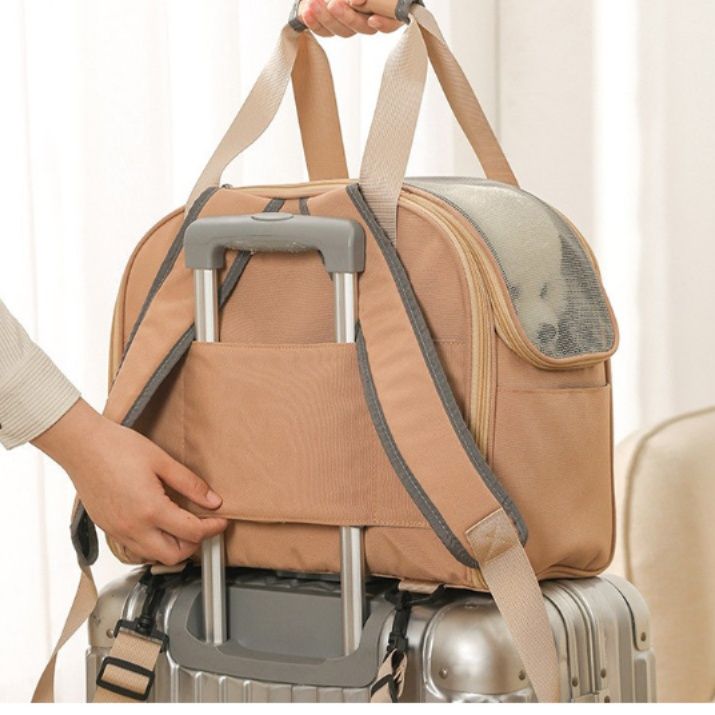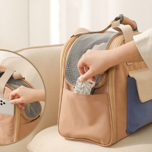 通気性抜群のメッシュ窓が愛犬の快適さを保ち、側面には小物収納用ポケットも完備しています。