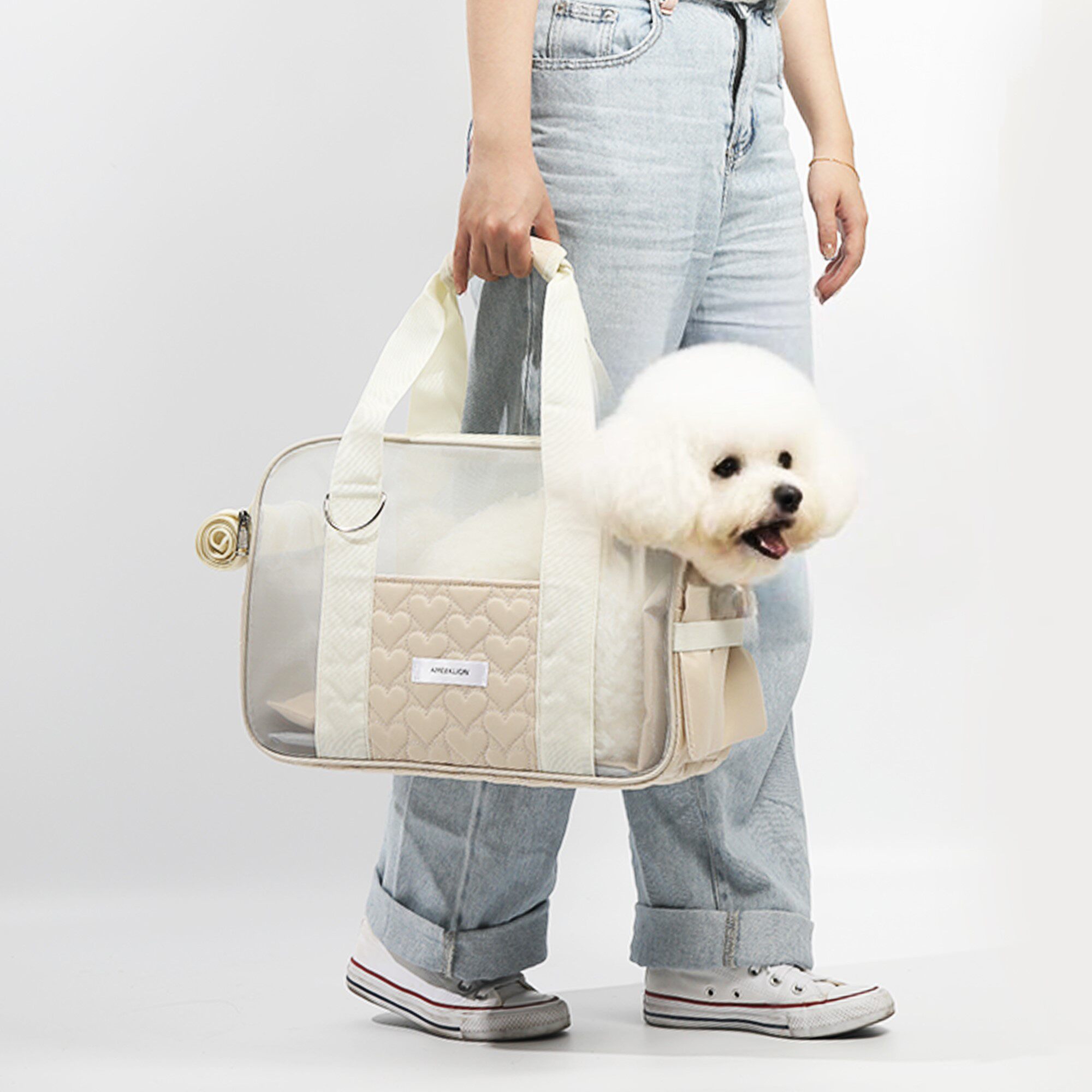 サイドポケット付きでおやつや小物の収納も充実しており、小型犬とのお散歩や通院に最適な機能性とデザイン性を兼ね備えた犬バッグです。