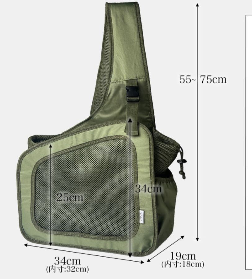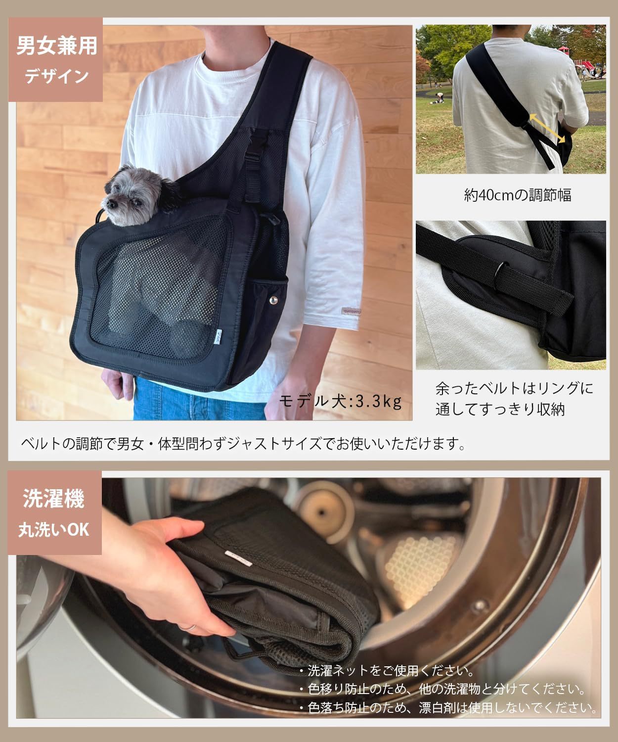 サイドポケットや調整可能なストラップなど機能性も充実しており、小型犬のお散歩や通院、旅行にも便利にお使いいただけます。